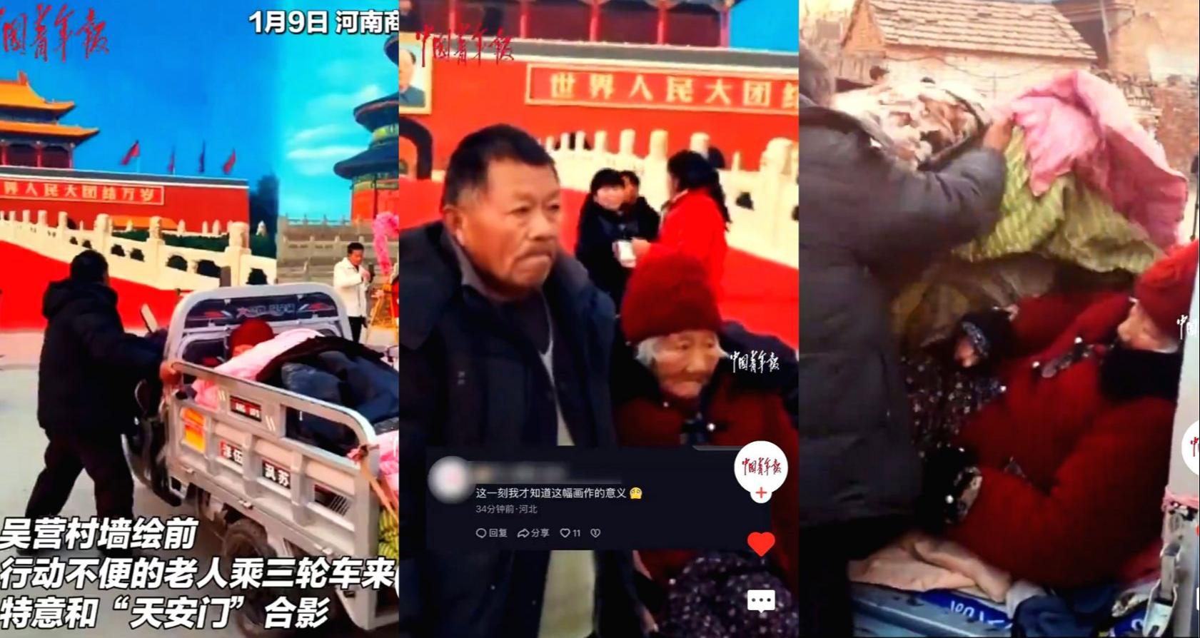 大叔骑三轮车将行动不便的老母亲带到吴营村墙绘前,与“天安门”合影。网友:这一刻我才知道这幅画作的意义!