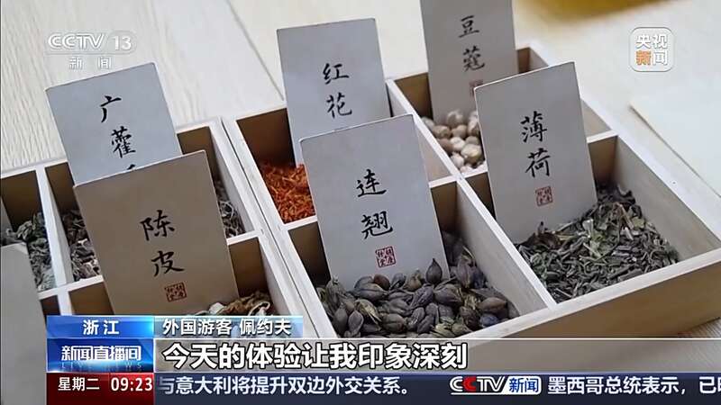 在浙江河坊街的杭州胡庆余堂国药号,一群来自保加利亚的游客正在体验区里学习中药香囊制作。药师拿出研磨好的丁香、艾叶、薄荷等十余种芳香药材,向大家一一介绍它们的名称及功效。