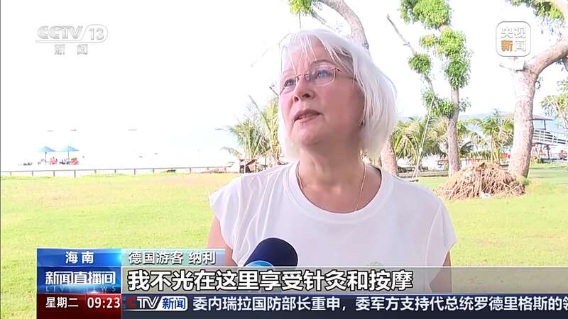 德国游客纳利:我不光在这里享受针灸和按摩,也感受三亚的气候,像在家里一样舒服。通过学习中医健身操、太极和毛笔字等,我感到身心愉悦。