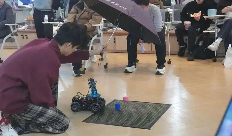 比赛过程中,不同的意外问题挑战着学生的应变能力。视觉组遇到了意想不到的“对手”——活动室的灯光。光线变化导致颜色识别出现偏差,他们不得不现场调整算法参数。“如何在短时间内化险为夷?这比在实验室里难多了!”陈怡瑾同学说起比赛现场还意犹未尽。抓取力度的控制、程序的突然卡顿……平时课堂上提到的理论难题,在实战中变得无比真实。还有一组同学的机械臂电机突然过热导致程序卡顿,全组在10分钟内迅速分工:有人“寻虫”排查代码,有人测试硬件连接,有人想办法降温……这种在真实项目中锤炼出的抗压能力和协作精神,正是学院倡导的核心素养之一。同学们的精彩表现赢得了现场师生的阵阵掌声。