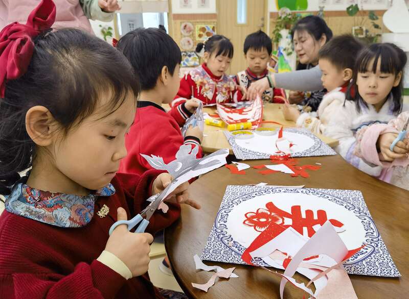 1月13日,青岛市崂山金融区实验幼儿园,一名小朋友正神情专注地剪纸。李庚伟/摄