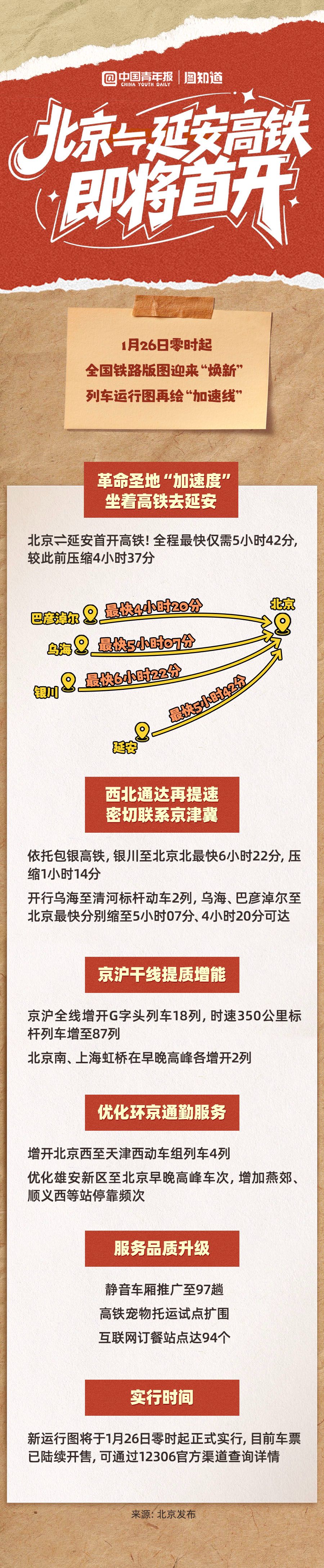 太方便了!延安首开至京高铁,革命圣地延安融入首都“半日交通圈”!1月26日零时起,北京至延安最快5小时42分直达,这波提速太给力!2026年还有哪些线路新增、调整和服务升级?一图速览!