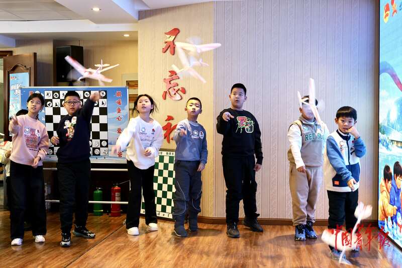 1月14日,黑龙江哈尔滨,孩子们在台上试飞组装好的飞机。中青报·中青网记者 杨雷/摄