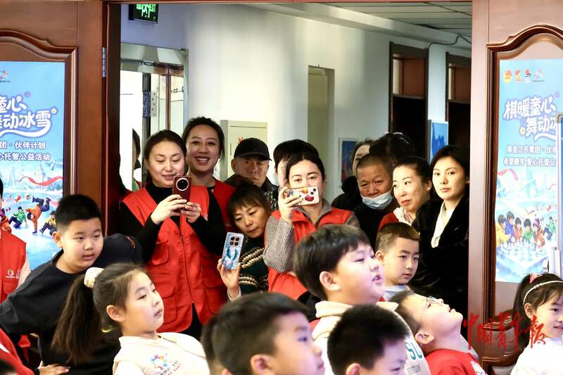 1月14日,黑龙江哈尔滨,试课活动现场,一位家长给孩子拍照留念。中青报·中青网记者 杨雷/摄