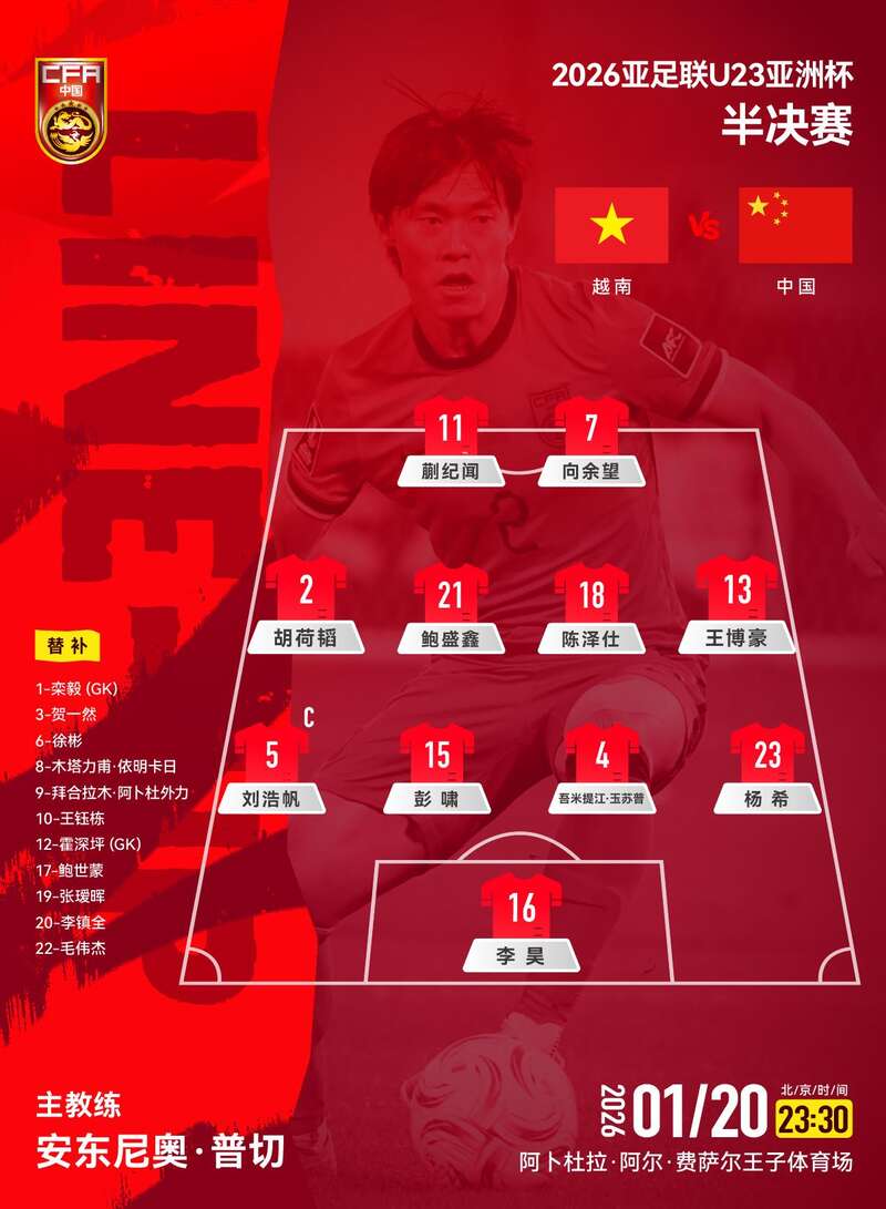 北京时间1月21日凌晨结束的2026年亚足联U23男足亚洲杯半决赛中,中国U23男足再度创造历史。两队上半场战成0比0。下半场,中国队先是凭借彭啸、向余望的进球取得领先。在临近终场时,王钰栋再度破门为中国队锁定胜局。最终,中国队3比0战胜越南队,将在24日举行的决赛中迎战日本队。