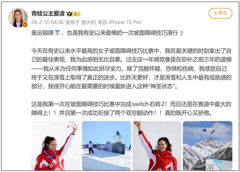 今天凌晨,谷爱凌在社交平台发文称:“奥运银牌,也是我有史以来最棒的一次坡面障碍技巧滑行。”“我在最关键的时刻拿出了自己的最佳表现,我为此感到无比自豪。”