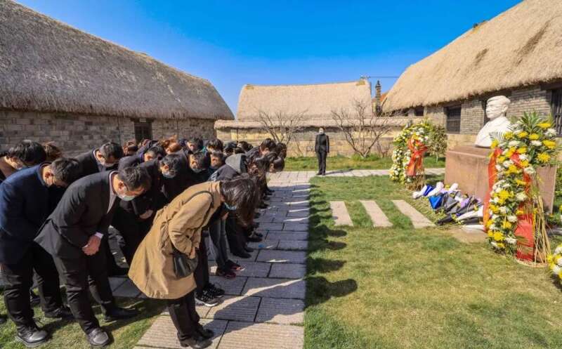 2021年4月4日,在山东荣成滕家镇郭永怀故居,人们向郭永怀雕像鞠躬。