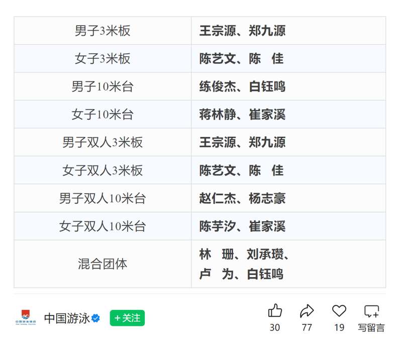 4月13日,中国游泳协会官微公布中国跳水队参赛日程及报项名单。名单显示,陈芋汐将搭档崔家溪出战女子双人10米台项目。