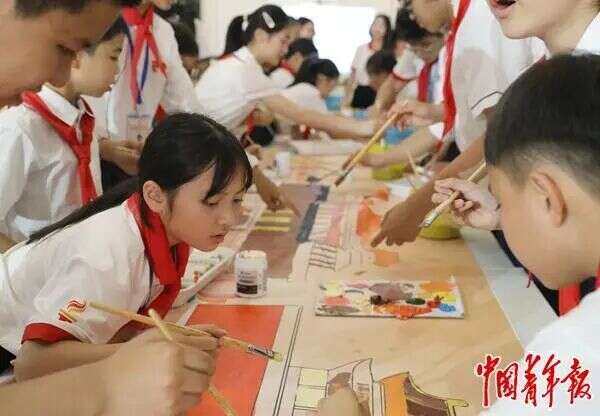 △4月12日,广东省广州市第三少年宫,“中越少先队员共绘一幅画”活动在这里举行。越南青年来华“红色研学之旅”之“不忘初心”研学营少先队分团的少先队员、少先队辅导员和广州市的少先队员、少先队辅导员等共同参与。他们所绘的画卷中,有中共一大会址、越中友谊宫等红色地标,有万里长城、天安门、越南文庙、顺化皇城等文化遗产,有复兴号高铁、天宫、越南金桥、地标塔81等两国现代化建设成果,寓意中越两国人文相亲、命运与共、情谊深厚,表达了两国少先队员传承红色基因、共创美好未来的共同心愿。(中青报·中青网记者 陈剑/摄 来源:中国青年报今日1版 )