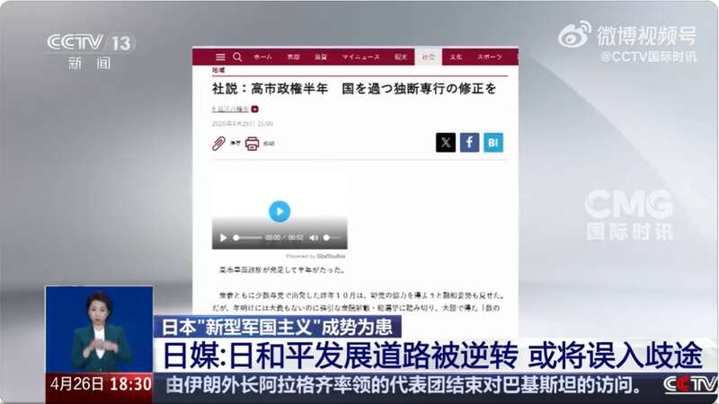 据CCTV13,近期,日本高市政权不断在军事上寻求松绑,并企图修改宪法,引发日本国内越来越多的反对声音。日本《京都新闻》4月25日发表社论说,日本的和平国家发展道路正被逆转,国家发展或将误入歧途。