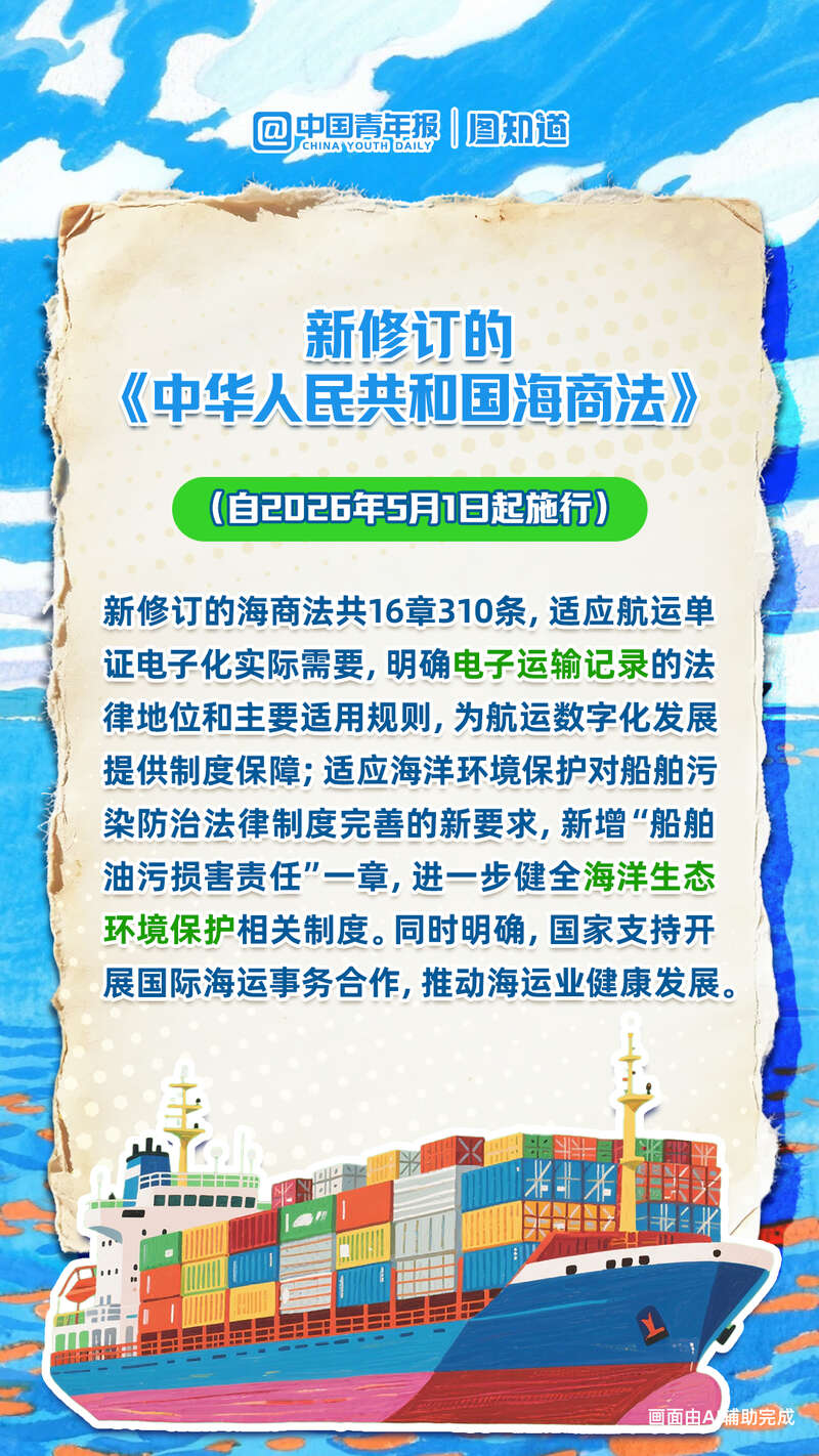 新修订的海商法、渔业法为行业发展护航,危险化学品安全法筑牢安全防线,无人机监管迎新国标,北京非机动车管理更严更暖……2026年5月,一批新规聚焦关键领域,统筹发展和安全。