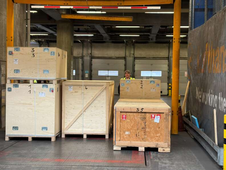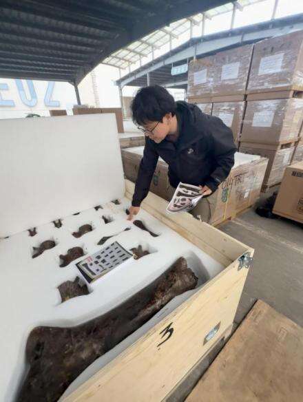 两具霸王龙化石是如何从德国运到中国的?化石的国际运输程序十分复杂,而且作为合作展品,本次进口需采用“临时进口”模式。两具大型的霸王龙个体骨架,拆散后的骨块装满了整整10个特制的木质运输箱。