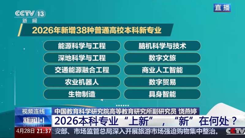 综合中国青年报今日2版、央视新闻,本科专业目录调整,与国家战略需求、民生发展需要密切相关。4月28日,教育部对外发布《普通高等学校本科专业目录(2026年)》,今年普通高校本科专业共新增38种,将于今年起招生。