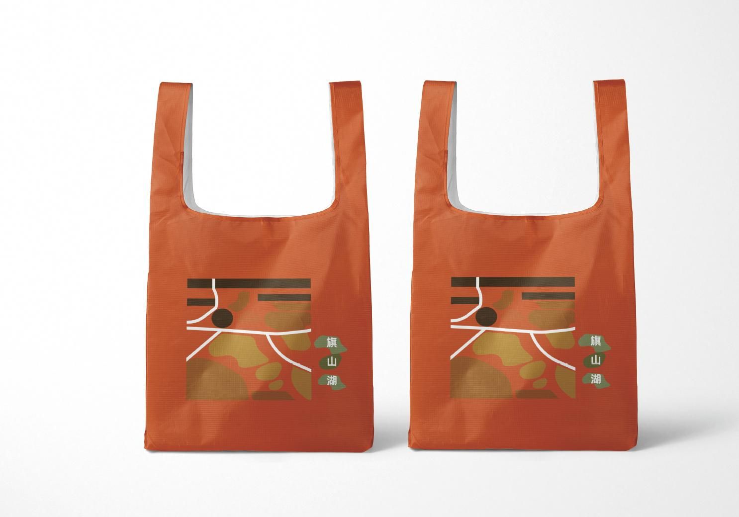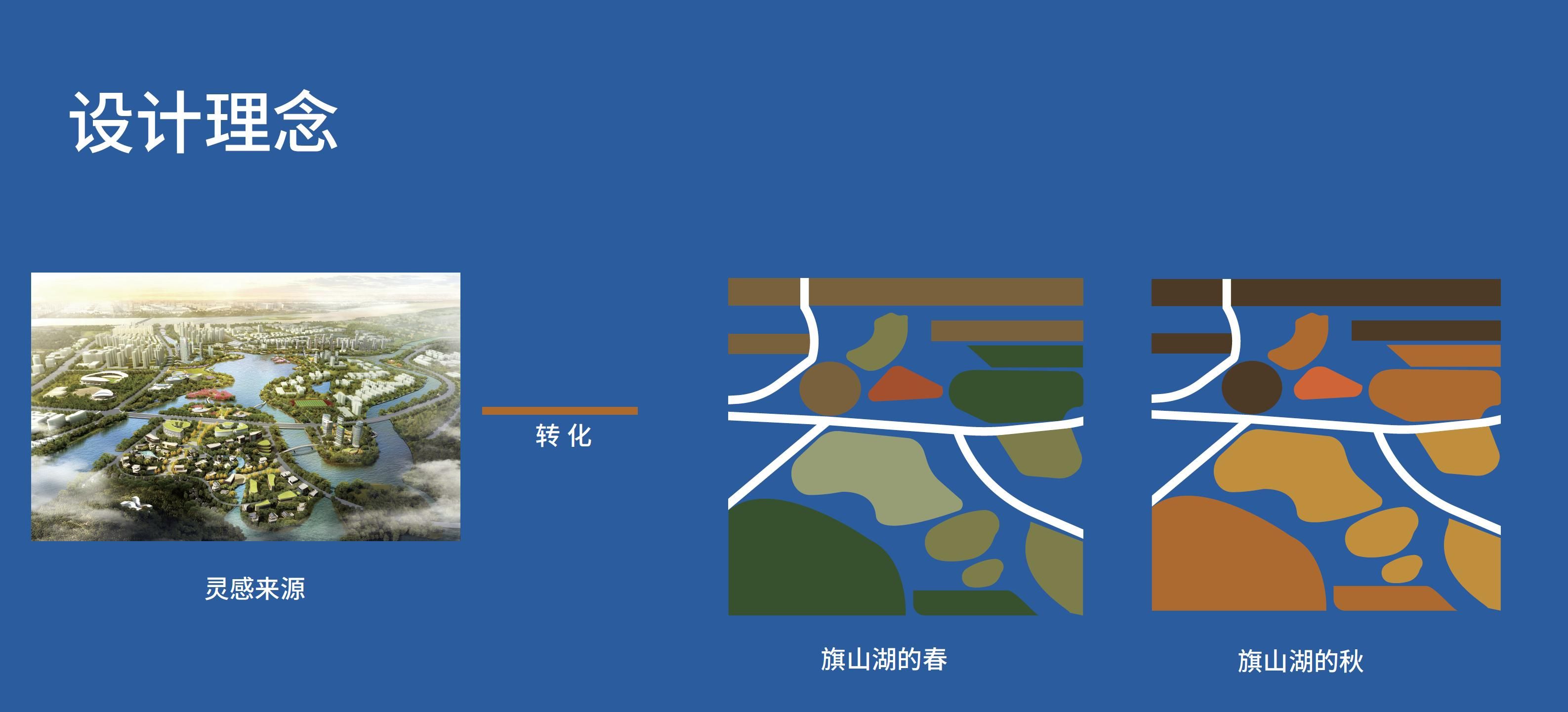 从旗山湖卫星图得到灵感,以碎片化重组分割的方式进行呈现 并做了春秋系列不同景象的形式让旗山湖更具有地域代表性,增强其识别力度。同时,体现环保理念和可持续发展战略。