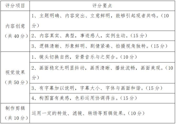 作品采用满分为100分的评分标准,根据作品的内容创意、视觉效果、制作剪辑三个维度进行综合评定得出分值。