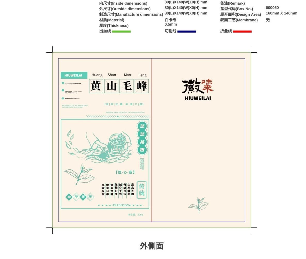 “徽”字运用徽州地区的屋檐飞角结构,中间部分上面的“山”运用黄山山型,下面的“系”字融合徽州特色食品“臭鳜鱼”鱼鳞生动形象,“味来”二字参考古代文献隶书书法,古韵十足,象征徽州人敦厚朴实的性格,“来”字捺笔画是小辣椒,暗喻食品商标,“徽味来”寓意“惠未来”,象征徽州美食,实惠美味走向未来!
