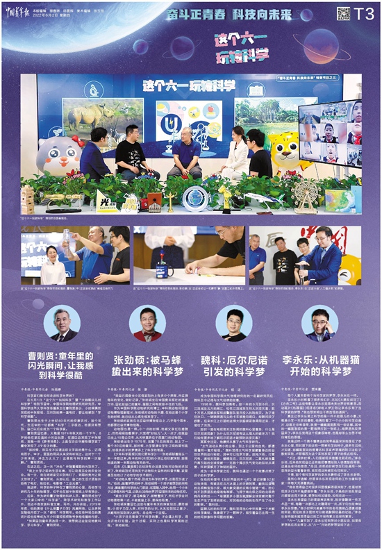 在6月1日“这个六一玩转科学”暨“大咖畅谈儿时科学梦”特别节目中,中国科学院物理研究所研究员,中国科学技术大学科学传播系主任曹则贤表示,小时候偶然发现的半张报纸,见识到的第一盏电灯,都让他感到“学科学很酷”。