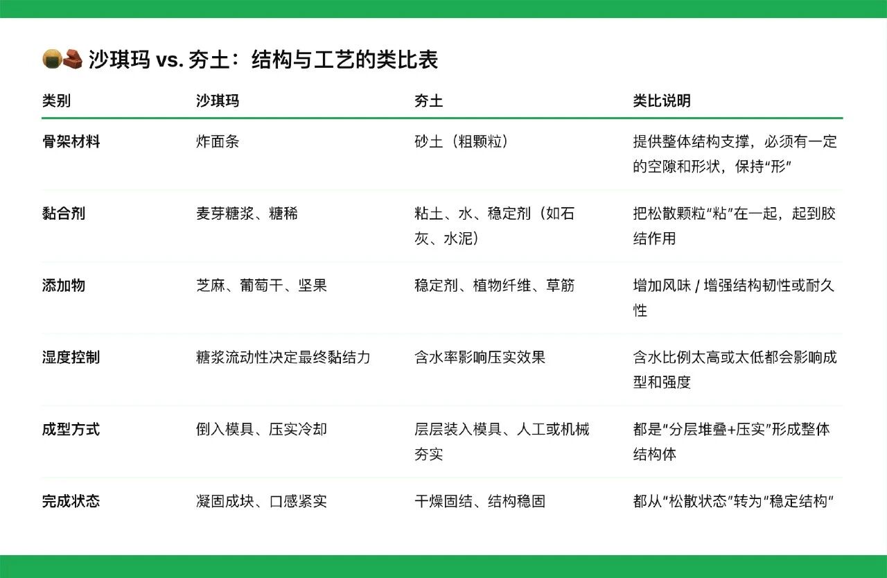任老师说砂(也就是粗颗粒的泥土)是“骨料”——我起初空耳听成了“果料”,觉得好形象!以为夯土像是做沙琪玛;泥(粘土)是面团,石灰是糖浆,砂石是果料(参考下图)。无论是沙琪玛还是夯土,它们都不是纯粹均质体——不像水泥浇筑那样流动密实,而是松散颗粒通过某种方式彼此协作、稳定存在。它们的工艺精髓不在于原料有多高级,而在于配比是否合理、压实是否充分——这也正是乡土智慧的体现,是泥土文明的内在知识。