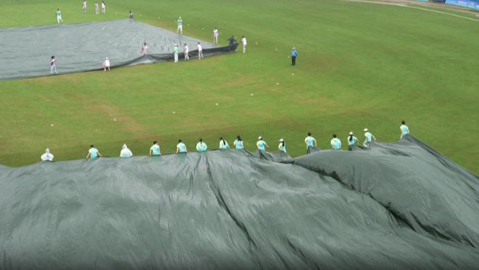 亚运赛场突然下雨 “小青荷”急速为球道“穿雨衣”