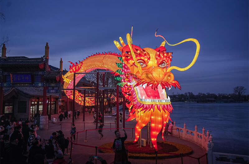 巨型龙灯“蛟龙出海”在北京什刹海荷花市场试亮相