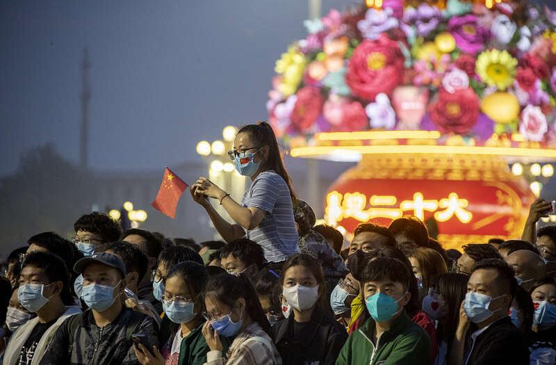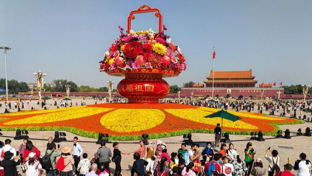 天安门广场巨型花篮装扮完毕,正式亮相,引游人参观留念。