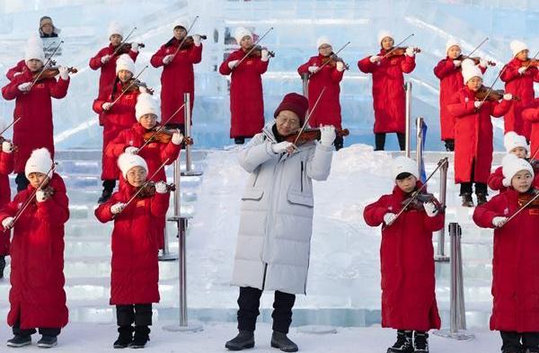 哈尔滨冰雪大世界园区上演音乐“快闪”,为即将到来的亚冬会助力