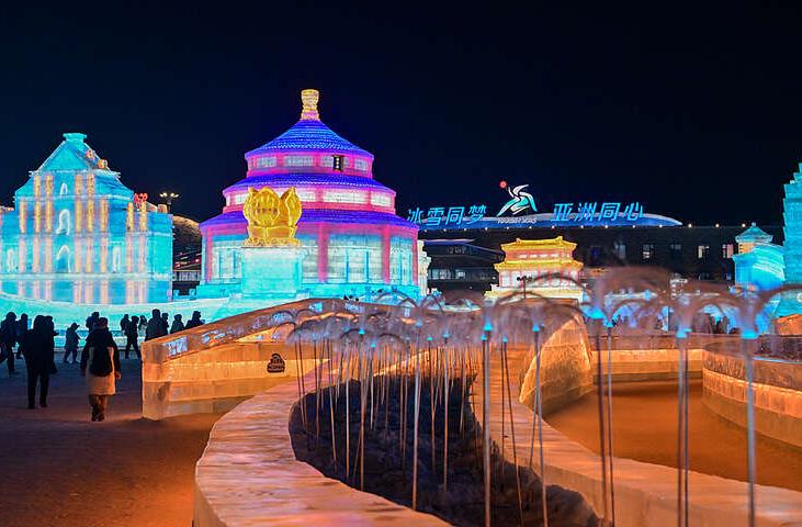 哈尔滨冰雪大世界园区的设计和建设也充分融入亚冬会元素。