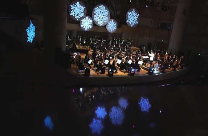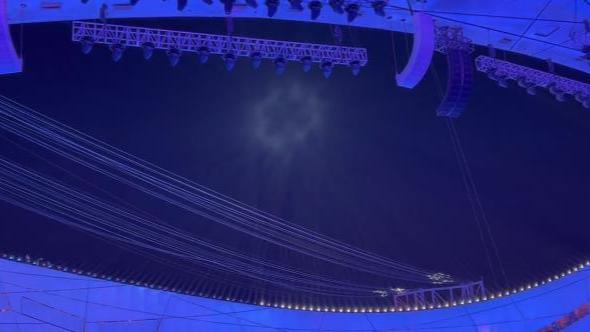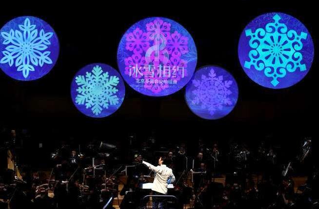冬残奥会仪式前表演环节,鸟巢顶部打出的光束,在夜空中形成缓缓旋转的白色花朵。