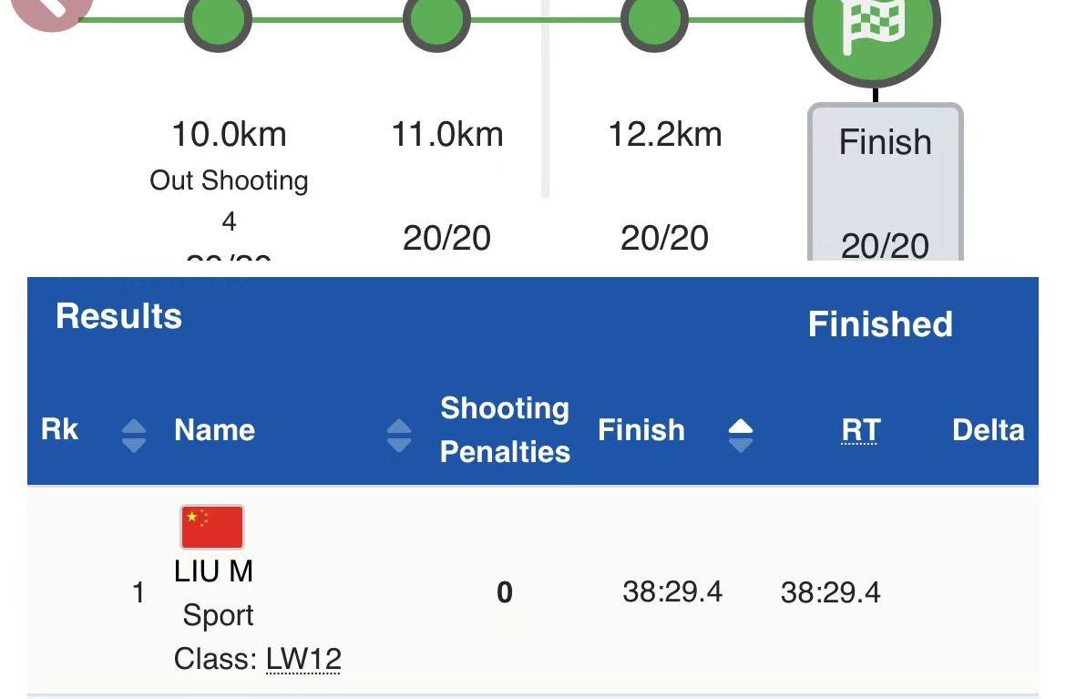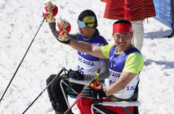 残奥越野滑雪男子短距离坐姿,中国选手包揽金银牌。