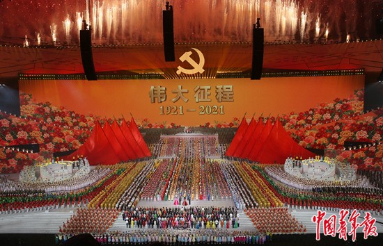 6月28日,北京国家体育场,庆祝中国共产党成立100周年大型文艺演出现场,演出即将结束,演员们集体上台谢幕,绚烂的焰火盛放在体育场上空。中青报·中青网记者 陈剑/摄