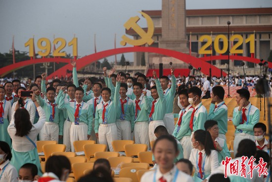 7月1日早,北京天安门广场上,演出人员和嘉宾伴随着朝阳早早入场,庆祝中国共产党成立100周年大会开始前,合唱团的孩子们在广场上合影留念。中青报·中青网记者 陈剑/摄