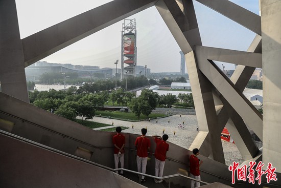 6月28日,北京国家体育场,演出开始前,几名年轻的观众在会场外眺望远方。在当晚举行的庆祝中国共产党成立100周年大型文艺演出现场,台前幕后都能看到许多年轻人的身影。中青报·中青网记者 赵迪/摄