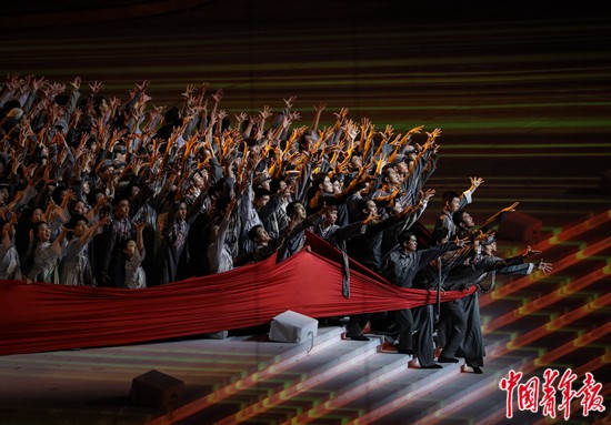 6月28日,北京国家体育场,庆祝中国共产党成立100周年大型文艺演出现场,表现建党早期历史的戏剧与舞蹈节目《破晓》。中青报·中青网记者 赵迪/摄