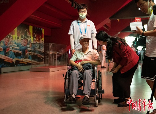 6月28日,北京国家体育场,一位老党员受邀参加庆祝中国共产党成立100周年大型文艺演出。中青报·中青网记者 李峥苨/摄