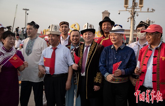 7月1日早,北京天安门广场,庆祝中国共产党成立100周年大会开始前,各民族代表手拿党旗合影留念。中青报·中青网记者 李峥苨/摄