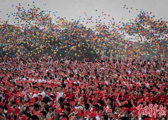 7月1日,北京天安门广场,庆祝中国共产党成立100周年大会结束前,观礼嘉宾挥舞国旗和党旗,身后无数彩色气球升空。中青报·中青网记者 李峥苨/摄