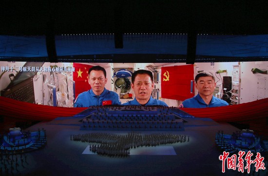 6月28日,北京国家体育场,庆祝中国共产党成立100周年大型文艺演出现场,神舟十二号航天员汤洪波、聂海胜、刘伯明(左至右)从太空发回祝贺视频。中青报·中青网记者 陈剑/摄
