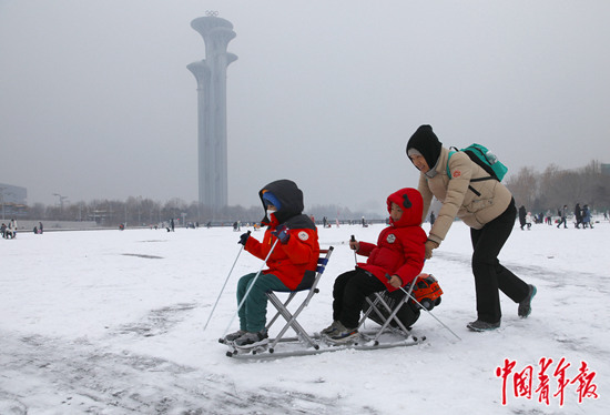 1月23日,北京奥林匹克公园北京观光塔下的一处冰场,一位母亲推着孩子玩冰车。北京观光塔以从低到高的五环图案作为塔的基本造型,是世界上唯一一个由五个塔独立组成的观光塔。时下正值寒假,不少家长带着孩子到此地,在冬奥场馆附近,感受冰雪运动的乐趣。 中青报·中青网记者 陈剑/摄