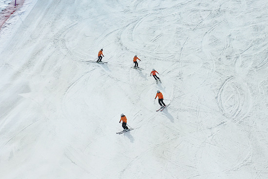 2021年3月14日,国家高山滑雪中心医疗队在崇礼训练(无人机照片)。 新华社记者 张晨霖/摄
