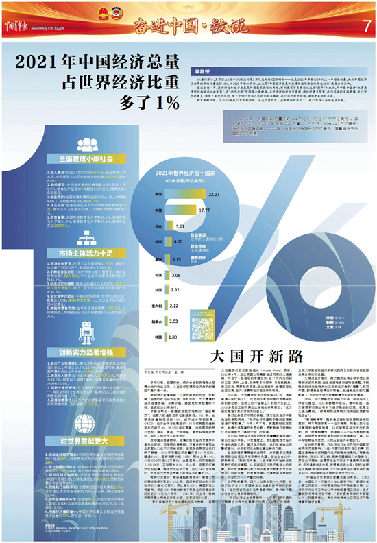 1%看似很小,其实很大!这个1%对应的是3万亿美元的GDP增长——这是2021年中国GDP比上一年增长的量,由此中国经济占世界经济的比重达到18%,比2020年增加了1%。这也是“中国经济发展和疫情防控保持全球领先地位”最有力的注脚。