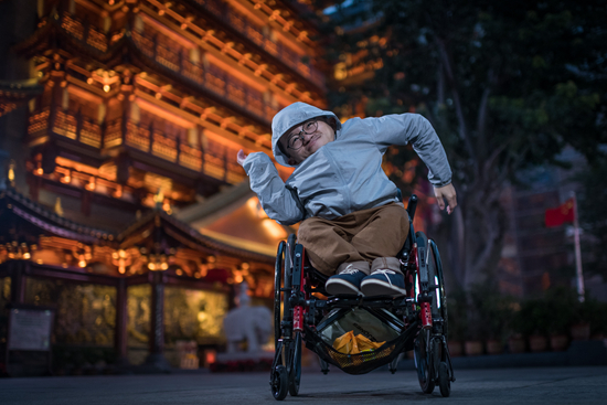 2019年2月25日,广州,慈善庙会结束后,翟进在西湖路大佛寺前即兴起舞。1岁半时,翟进被确诊为成骨不全症。这是一种被收录进国家罕见病目录的疾病。视觉中国供图