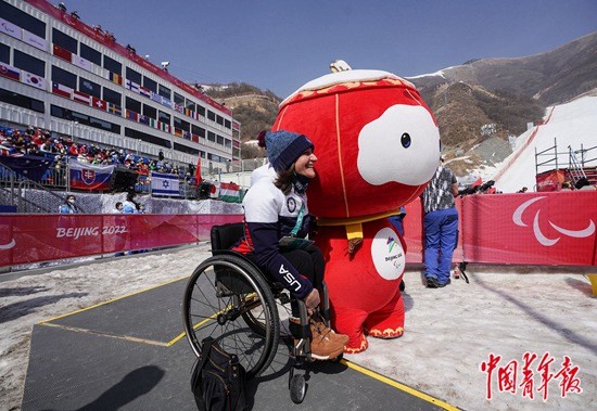 3月10日,北京2022年冬残奥会延庆赛区残奥高山滑雪男子大回转比赛期间,一名外国选手与北京冬残奥会吉祥物雪容融合影。 中青报·中青网记者 李峥苨/摄