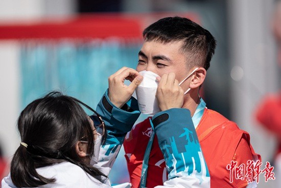 3月6日,北京延庆高山滑雪中心,男子超级大回转站姿组比赛后,工作人员为中国选手孙鸿胜戴上口罩。 中青报·中青网记者 李隽辉/摄