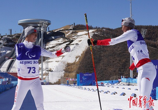 3月5日,北京2022年冬残奥会残奥冬季两项男子短距离(站姿)比赛中,冲过终点线后,中国选手李太云(右)伸出手和队友袁明寿“碰拳”。当日是本届冬残奥会首个比赛日,在张家口赛区国家冬季两项中心,各国运动员超越自我、完成了历史性突破,也用和平和友好阐释着“勇气、决心、激励、平等”的残奥价值观。 中青报·中青网记者 李峥苨/摄