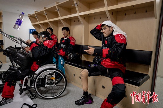 3月9日,中国残奥冰球队的选手在休息室中。当日,中国残奥冰球队在决赛资格赛中以4∶3力克捷克队,晋级半决赛。在本届冬残奥会中,首次亮相冬残奥会的中国残奥冰球队获得铜牌,创造历史。 中青报·中青网记者 李隽辉/摄