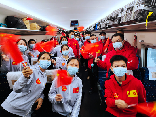 4月18日,广西南宁东站,医务人员乘坐动车前往上海,助力疫情防控工作。当天,第三批广西援沪医疗队启程奔赴上海。中新社记者 黄艳梅/摄