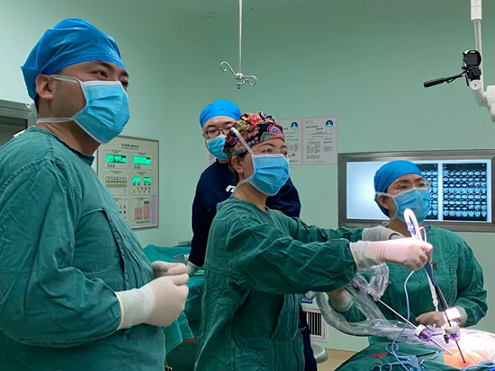 在河南省儿童医院手术室,成海燕(左二)正带领当地医生做腹腔镜肾上腺肿瘤切除术。受访者供图