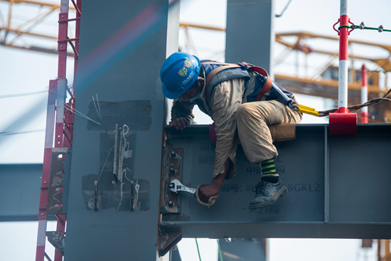 2021年9月,在中建科工承建的深圳湾区会展国际酒店项目现场,工人正在进行钢结构安装施工。 中建科工供图