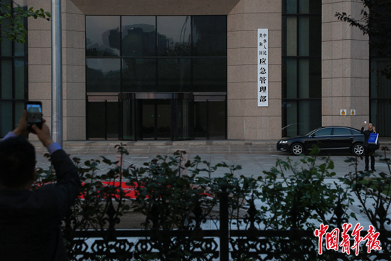 2018年4月16日,应急管理部门前,一名男士在拍照。中青报·中青网记者 赵迪/摄