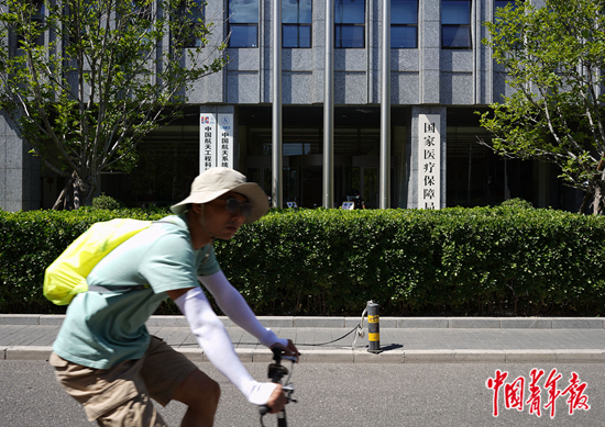 2022年5月25日,一位市民从国家医疗保障局门前经过。中青报·中青网记者 李峥苨/摄